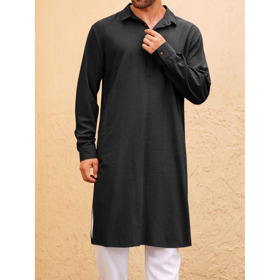 2025 hommes caftan Robe Thobe boutonné à manches longues coton lin Kurta hauts décontracté robe musulmane Polo chemise vêtements de nuit