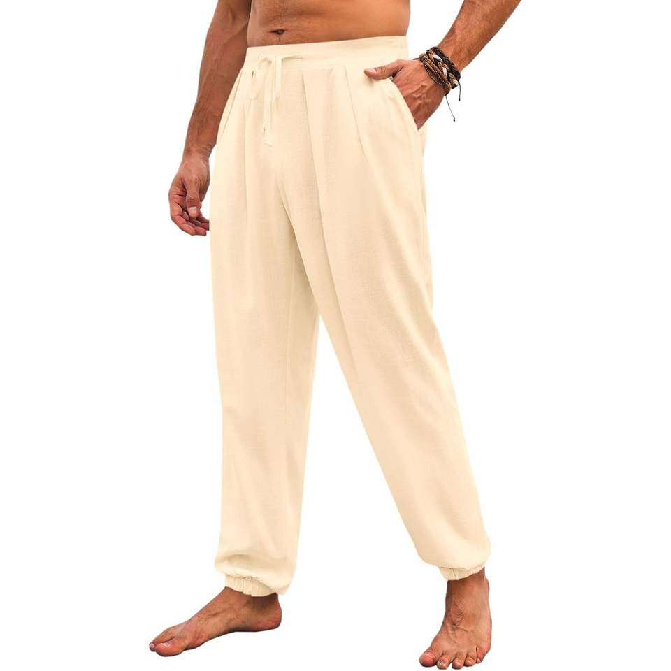 2025 Men's XL Casual Pants Elastic Mid Waist Linen Drawstring Pleated Joggers Summer Beach Yoga Trousers with Loose Fit