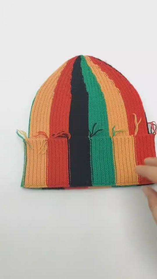 Description:Bonnet en tricot à franges avec manchette rayée Reggae Jamaica Rasta