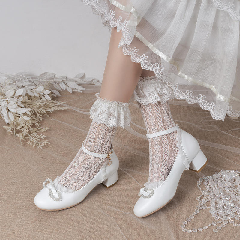Nouvelles chaussures de printemps et d'automne de style britannique 2025 : Sandales à talons mi-hauts et épais avec dentelle douce et perles de style bonbon