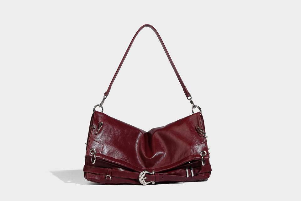 2025 New Burgundy Leather Shoulder Bag Metal Buckle Retro Pleated Design Women's Bag