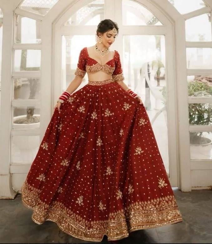 2025 @ New Dazzling Embellished Bridal Maroon Lehenga Choli & Dupatta with Heavy Dabka Pearls Stone Hand Zardozi Embroidery Work