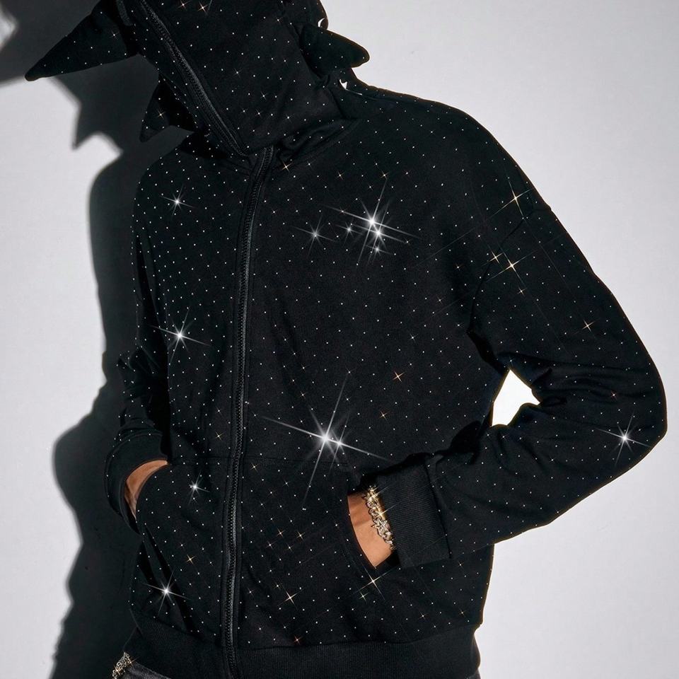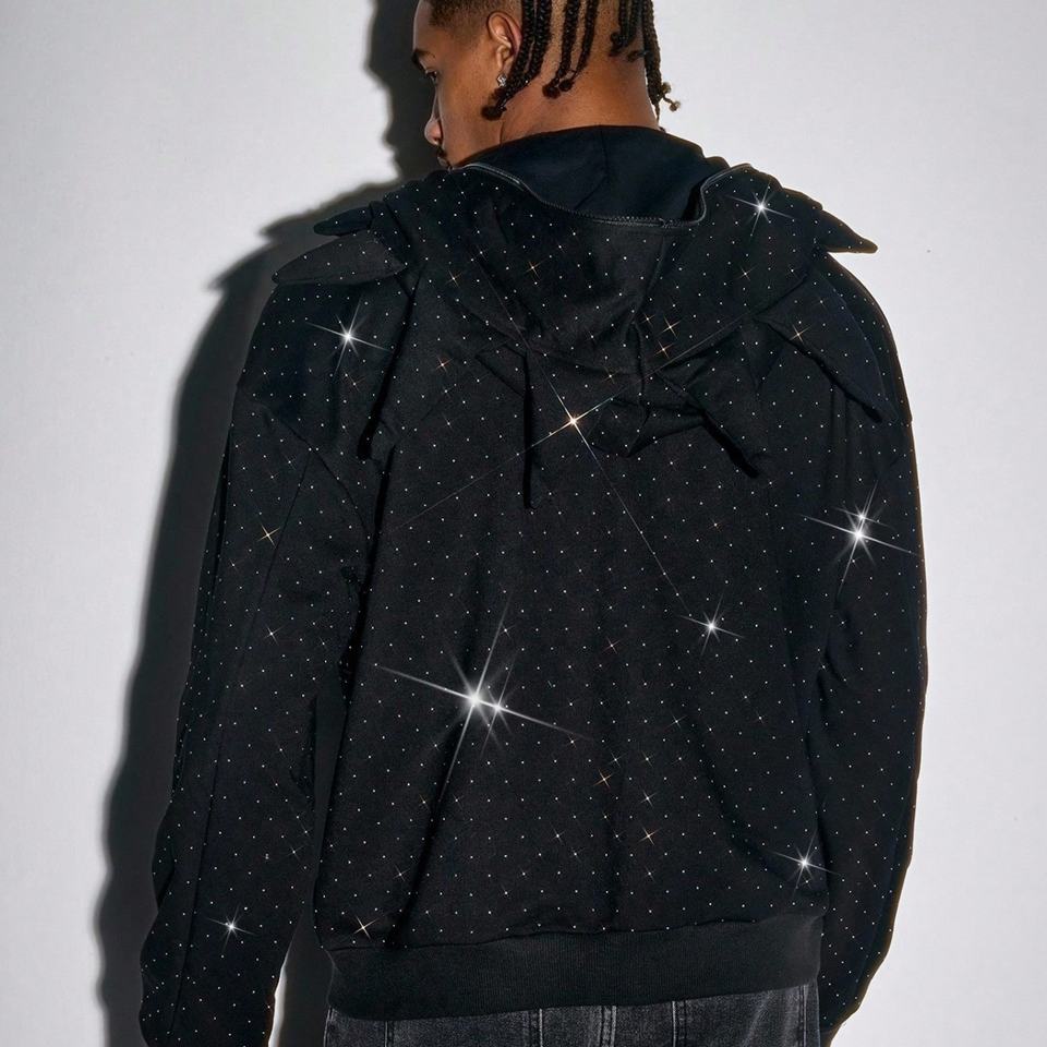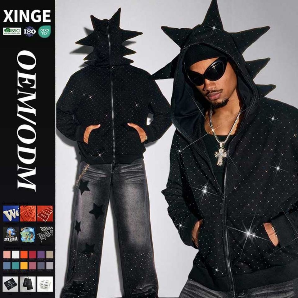 2025 New High Quality Autumn Oversized Men's Full Face Zipper Hoodie Custom Rhinestone Print Windproof Breathable Boxy Cropped