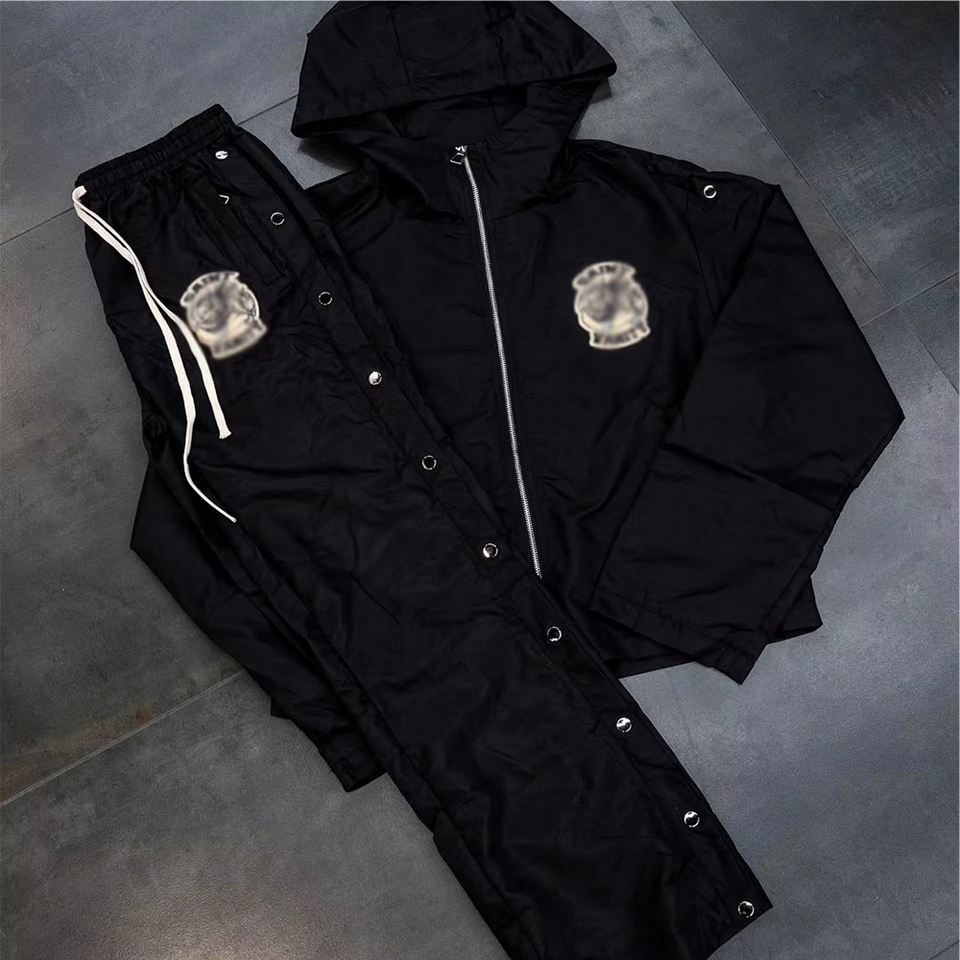 Nouvel ensemble de survêtements coupe-vent à capuche en polyester/coton de haute qualité pour l'hiver 2025, couleur unie, avec broderie de logo personnalisé noir