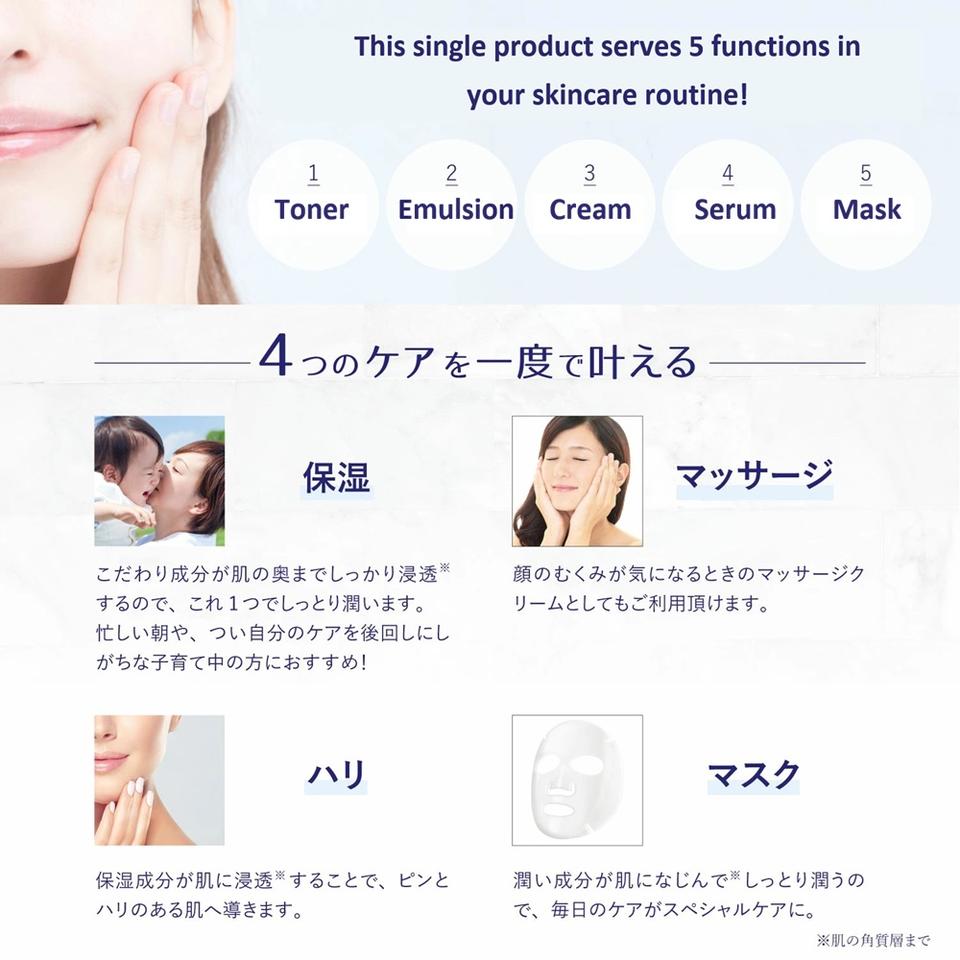 All in One, Five(5) Functions of:Skin Lotion, Emulsion, Cream, Cosmetic Liquid, and Facial Pack