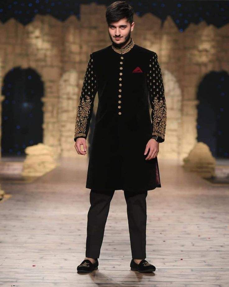 2025 New Latest Embroidery Groom Black Velvet Sherwani Pant Suits Breathable Plus Size Crystal Glass Beads Stone Dabka Work Men