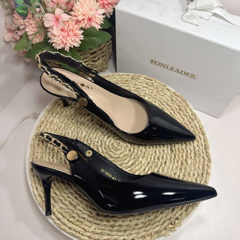 Nouvelles sandales noires à chaîne métallique 2025, chaussures brillantes pour femmes, talons slingback à bout pointu
