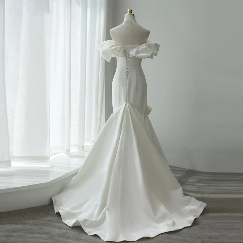 2025 nouveau Off Satin queue de poisson mariée français Simple tempérament gaze Dragon queue Super fée robes élégantes femmes soirée