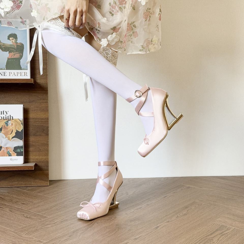 2025 New Pink Satin Lolita Pumps Elegant French Ballet Style Cross-Strap High Heels Open Toe Mesh Design for Girls Outdoor
