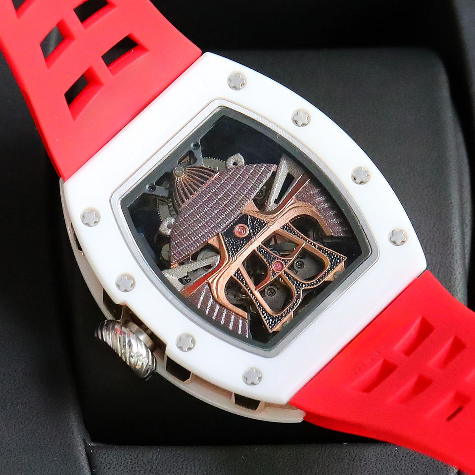 2025 New Rm White Ceramic Barrel Shaped Mechanical Watch Skeleton Dial Samurai Armor Tourbillon Design Luxury Sport Wristwatch