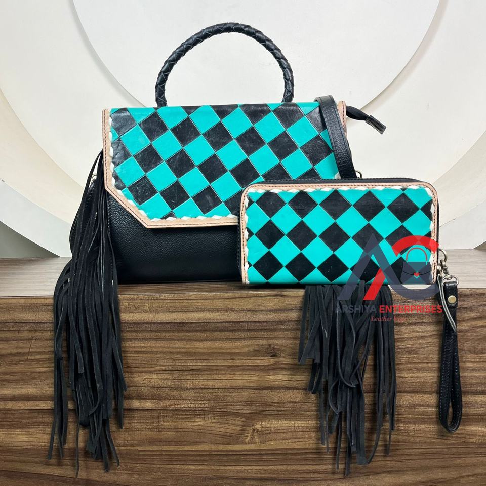 Ensemble combiné 2 pièces en cuir véritable taillé à la main à carreaux