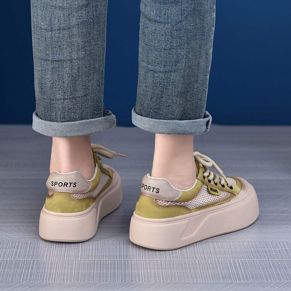 2025 New Women's Casual Retro Platform Sneakers Thick-Soled Mesh Hollow Breathable Pigskin Lining Couple Fitness Walking Shoes