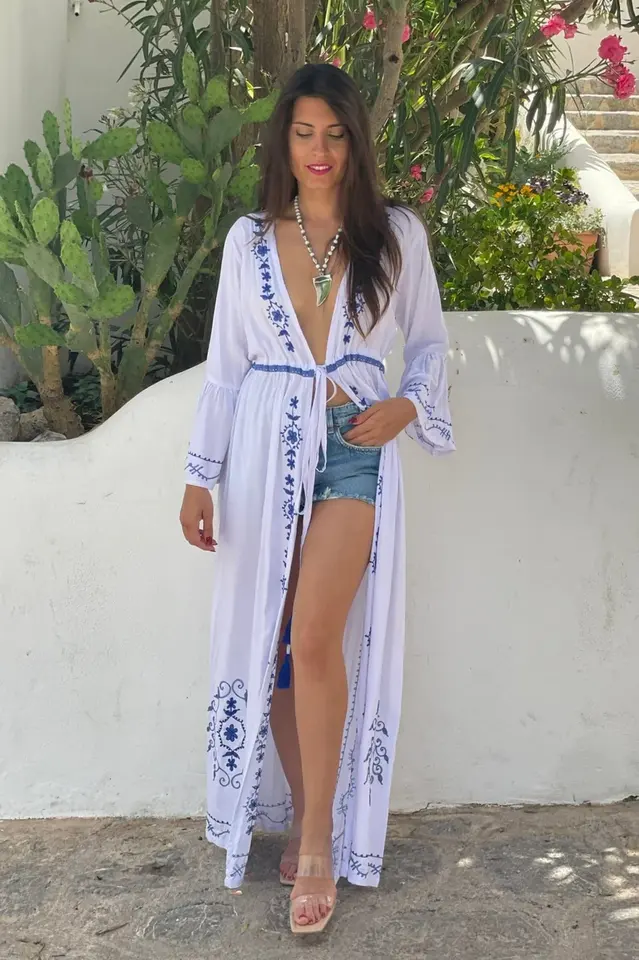 2025 surdimensionné dames Cardigan Kimono main broderie motif blanc à manches longues Boho Festival Style Long Kimono pour les femmes