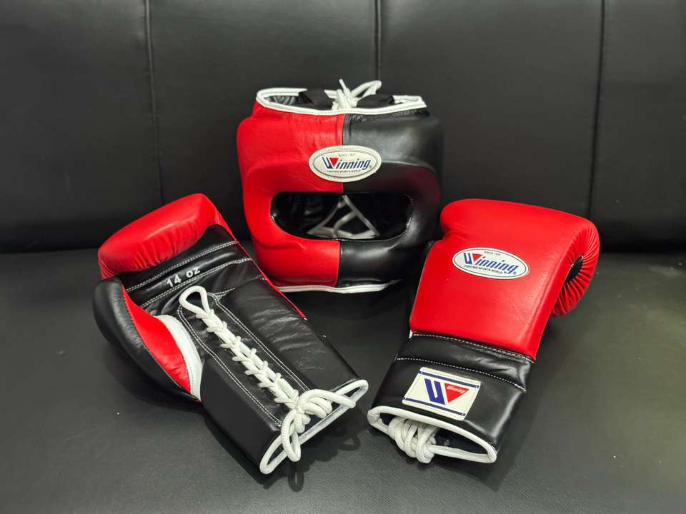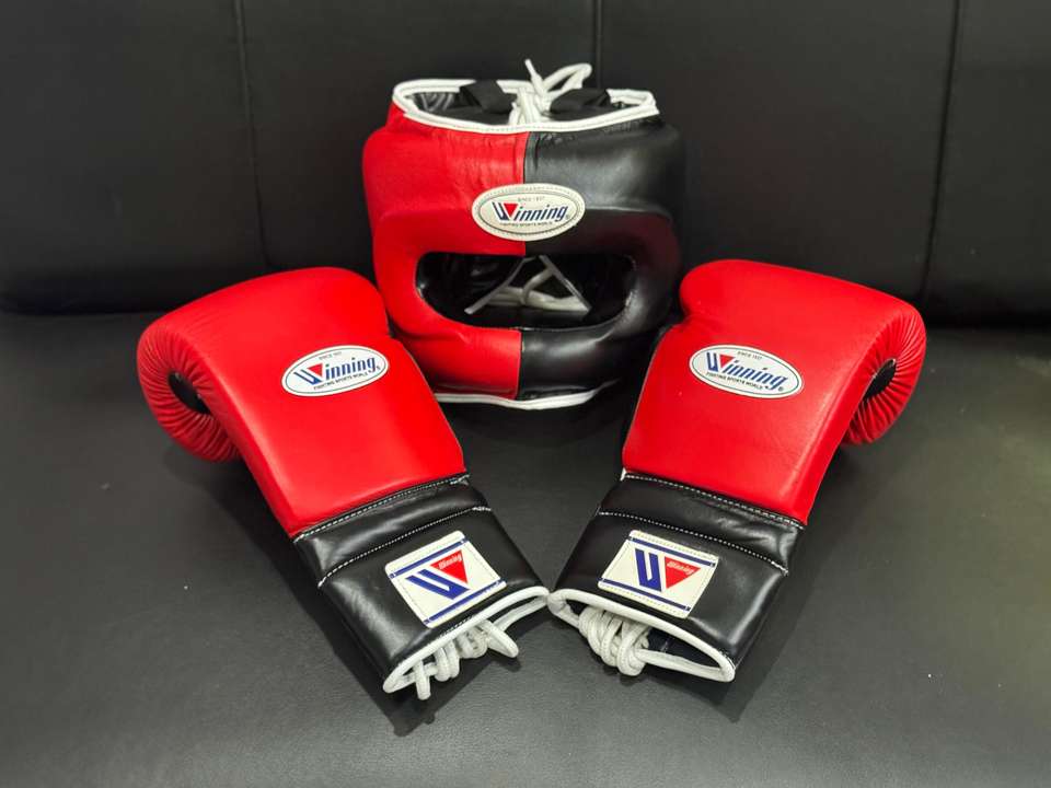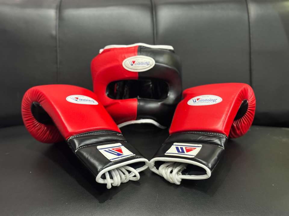 2025 ensemble de boxe gagnant de combat professionnel sur mesure couleur rouge et noir gants de boxe en cuir véritable et ensemble de protège-tête