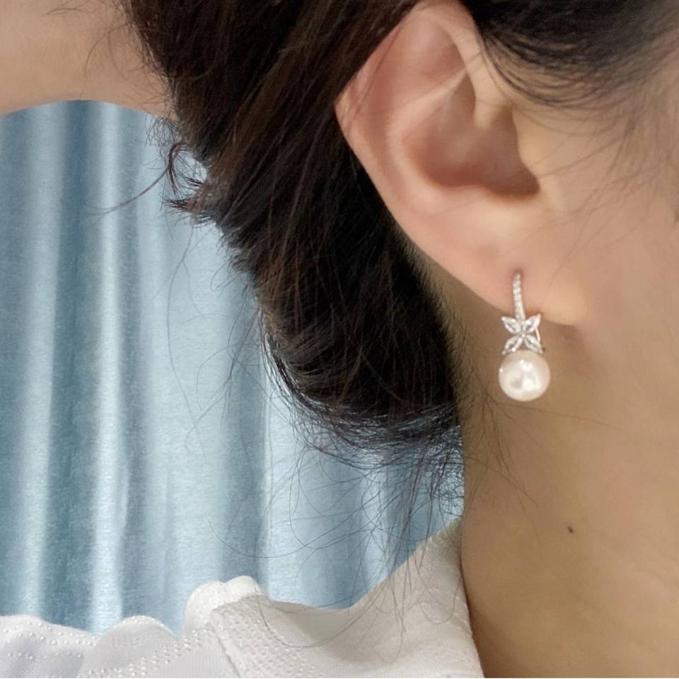 2025 S925 White Ear Ring with Four Leaf Grass Horse Eye Pearl Ear Hook 8-9mm Freshwater High-Plump Mantou Pearl Dangle Earrings