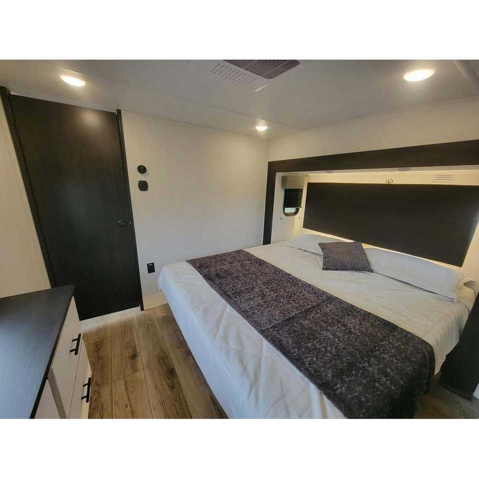 Camping-car coulissant 2025 Sabre SRF33RLP-C avec fonctionnalités étendues, construction en aluminium, couleur noire, capacité de couchage pour 8 personnes