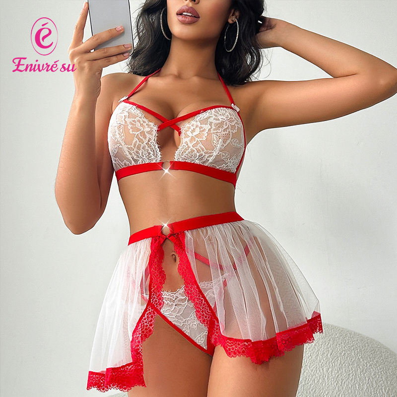Ensemble de lingerie sexy en dentelle transparente avec string pour femmes, lingerie sexy, ensemble trois pièces EY10501S
