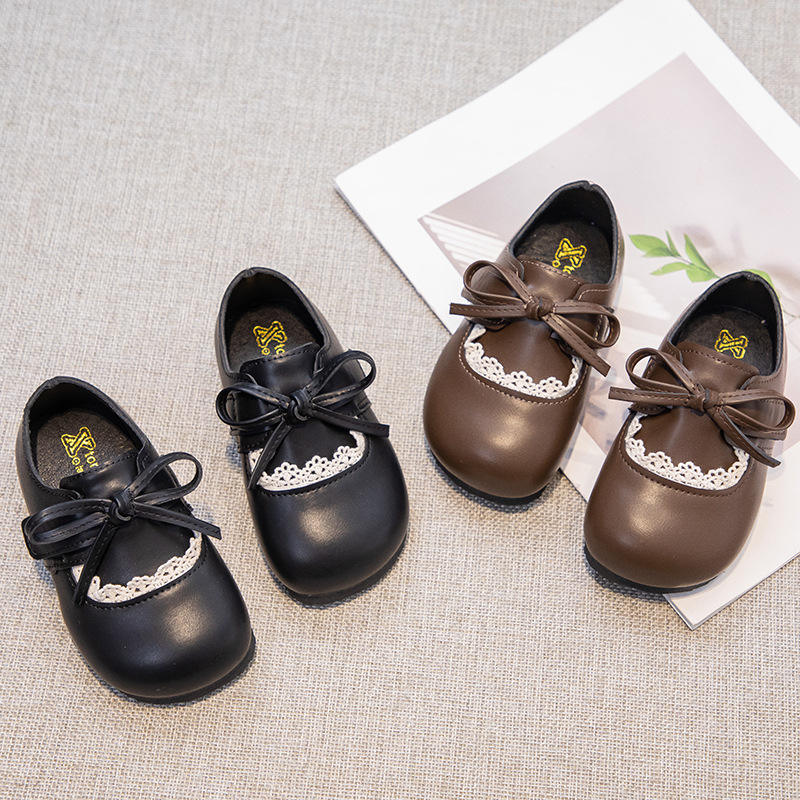 2025 printemps nouveau Style filles en cuir nœud dentelle princesse chaussures semelle souple PU semelle intérieure à la mode unique orteil chaussures pour enfants