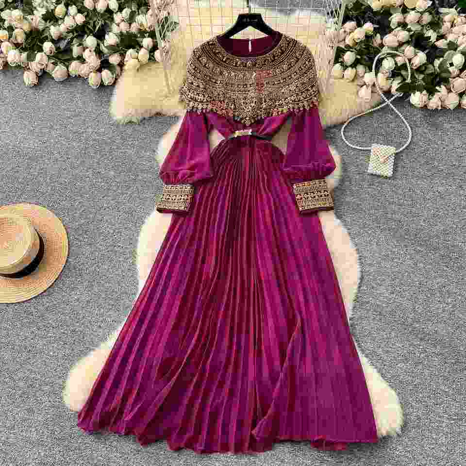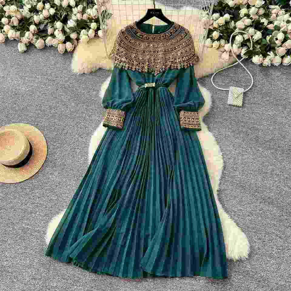 Robe mi-longue plissée style tunique romaine printemps 2025 pour femme, robe en dentelle patchwork à sequins coupe Empire