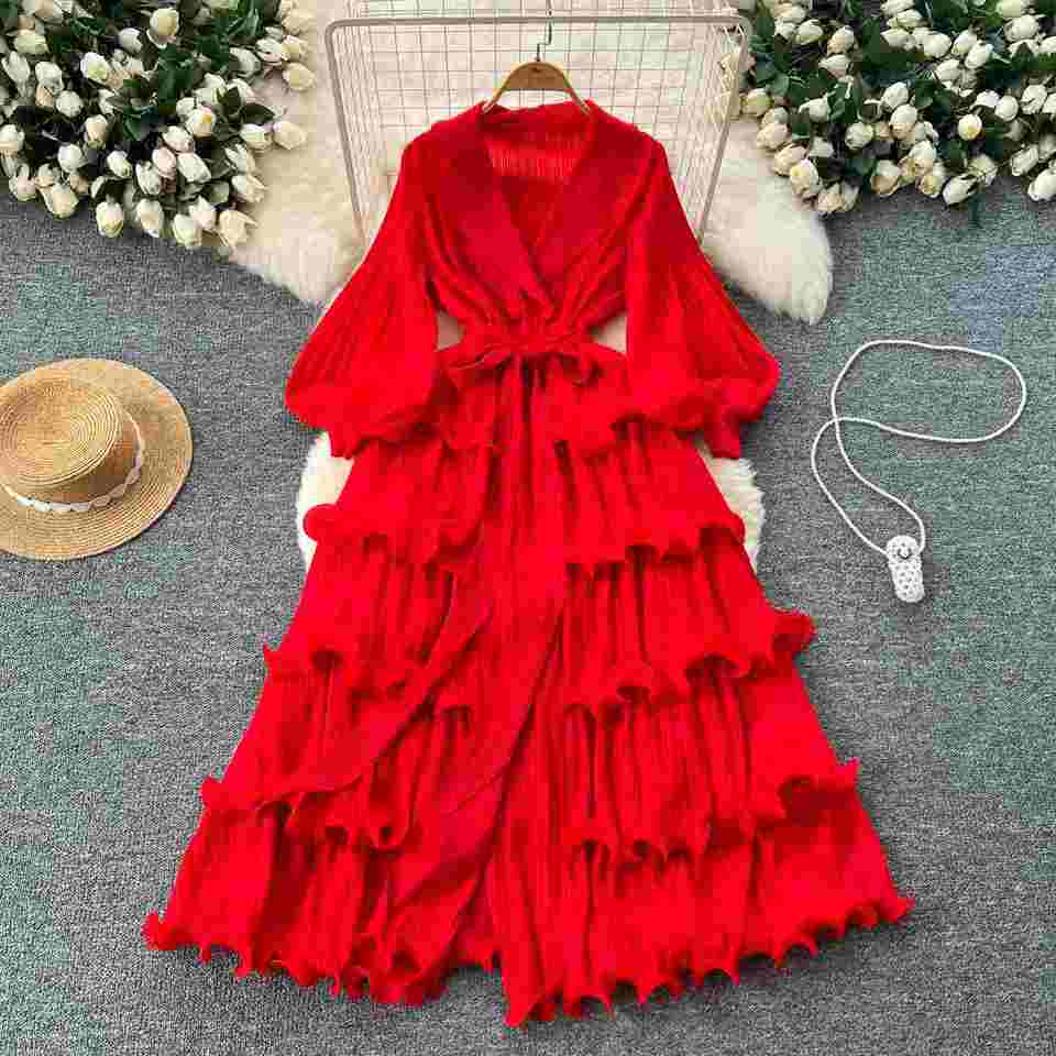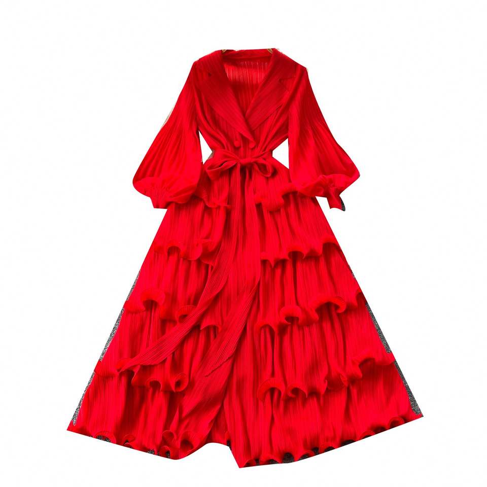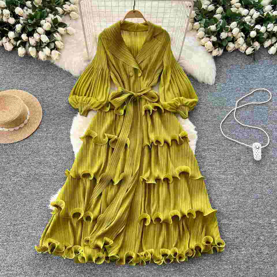 Robe Tunique Plissée Mi-Longue Vintage Printemps 2025 pour Femme avec Col Rabattu, Manches Lanterne, Taille Empire, Volants et Imprimé Numérique en Dentelle