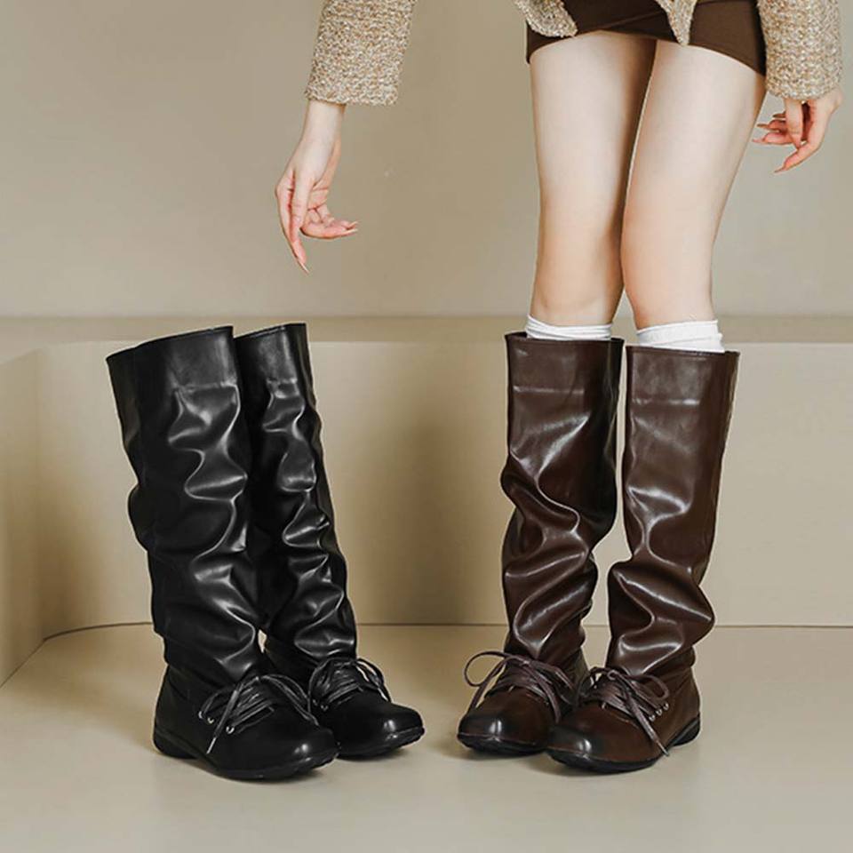 Bottes de cow-boy rétro à bout carré 2025, design froissé, lacets, talon épais, bottes confortables mi-hautes pour femmes