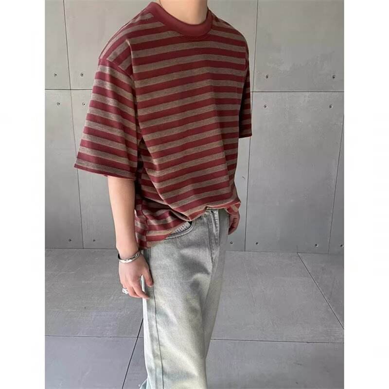 2025 Summer Loose Round Neck Beaded Solid Vintage Red Casual Men's Short Sleeve T-Shirt Trendy