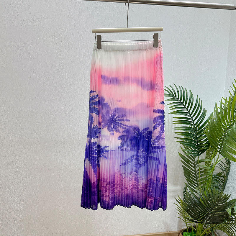 Jupe longue décontractée plissée pour femme, nouvelle collection été 2025, élégante, imprimé violet, écologique, respirante, 100% polyester, stock rapide