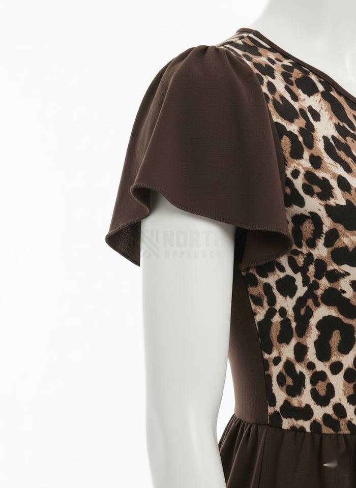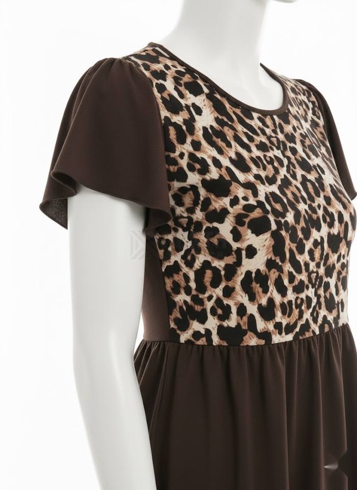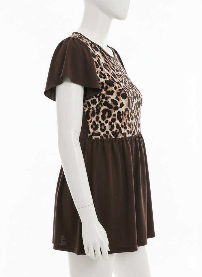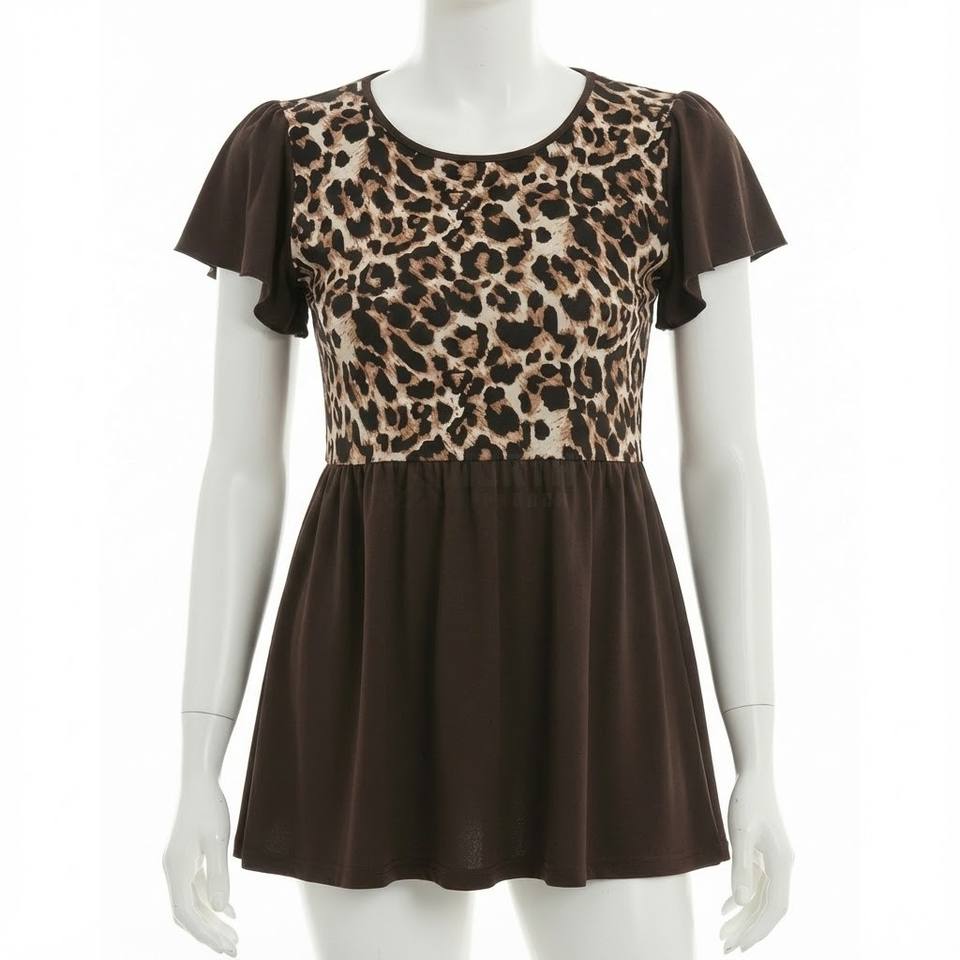 2025 Summer New Women's Crew-neck Splicing Leopard Print Lotus Short Sleeve Top Office Organza Woven Fashion