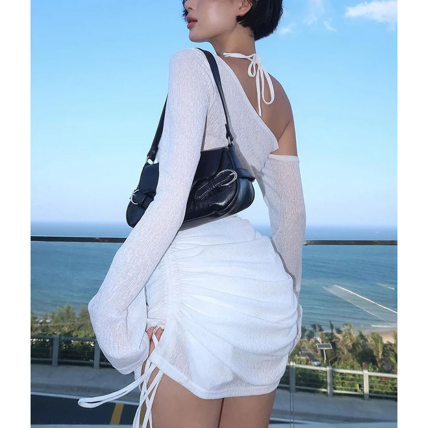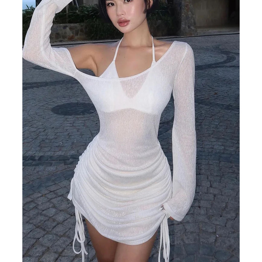 2025 Summer Women Party Clubwear Wholesale Solid Skew Collar Ruched Straps Lace-Up See Through Draw String Mini Dress