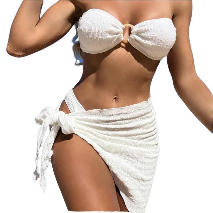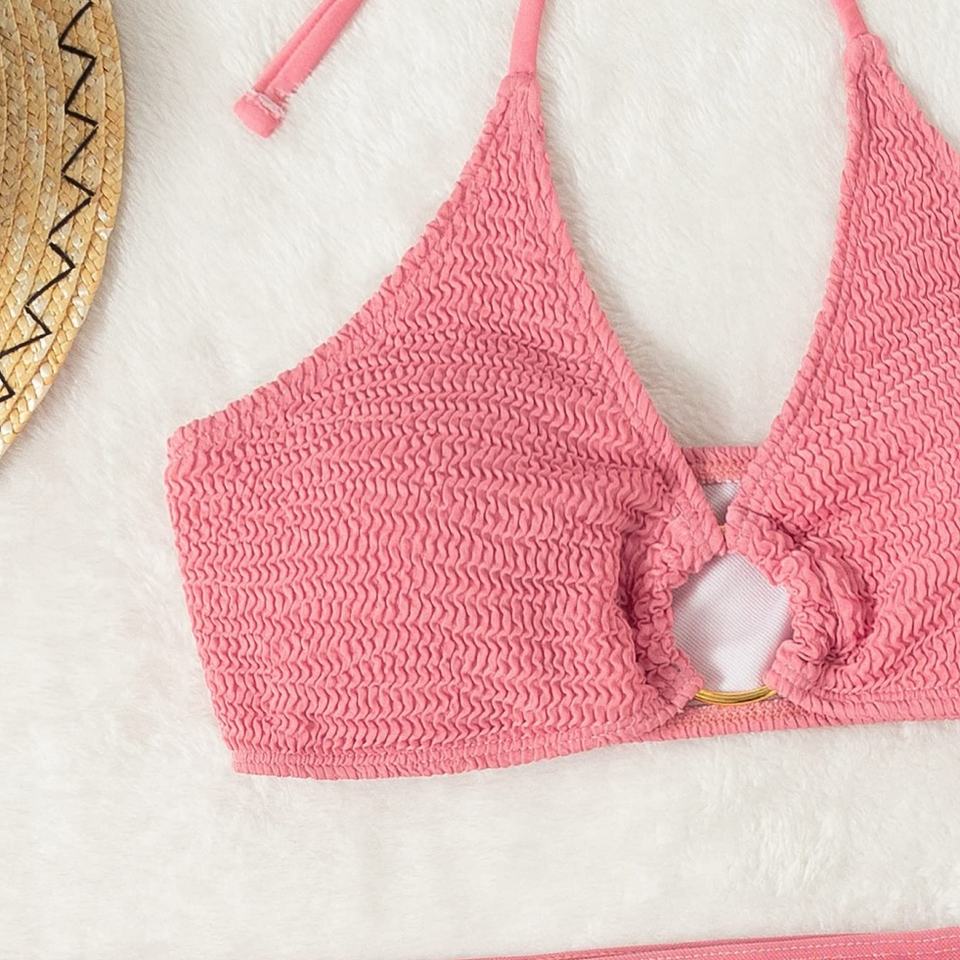 Ensemble bikini brésilien trois pièces 2025 avec soutien-gorge push-up sans bretelles, string, motif uni, respirant, en polyester/nylon