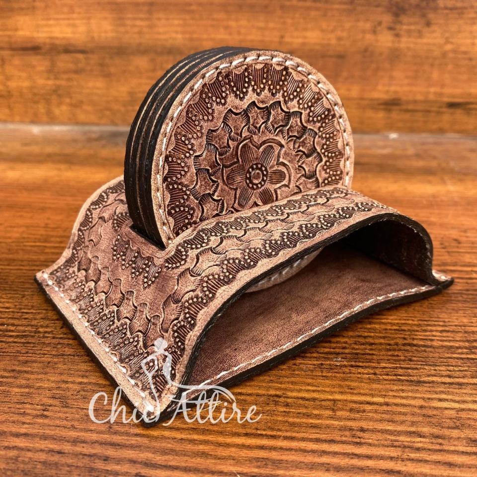 Product name:Hand Tooled Leather Coasters With Stand Coaster Set