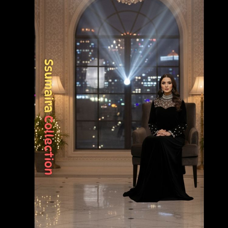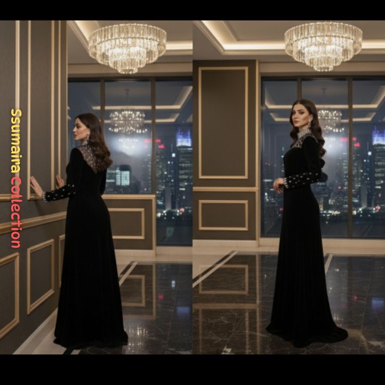 2025 Trends by Cp Present Wholesale Black Velvet Maxi Dress with Nagina Work High Neck - Winter Collection