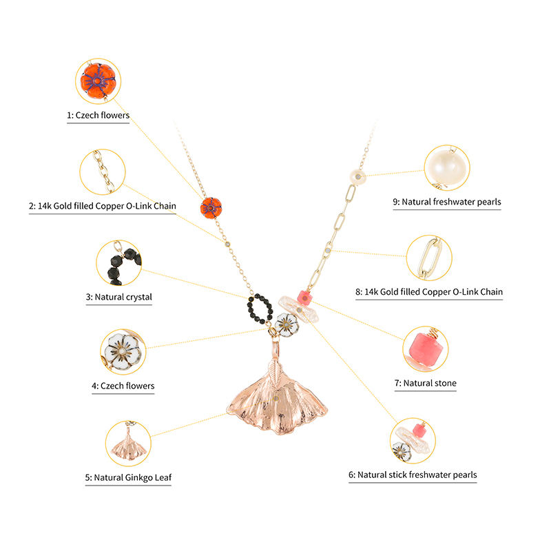 2025 Trendy Bohemian Ginkgo Leaf Necklace 24K Gold Plated Copper O-Link Czech Flower Freshwater Crystal Women's Gift Jewelry