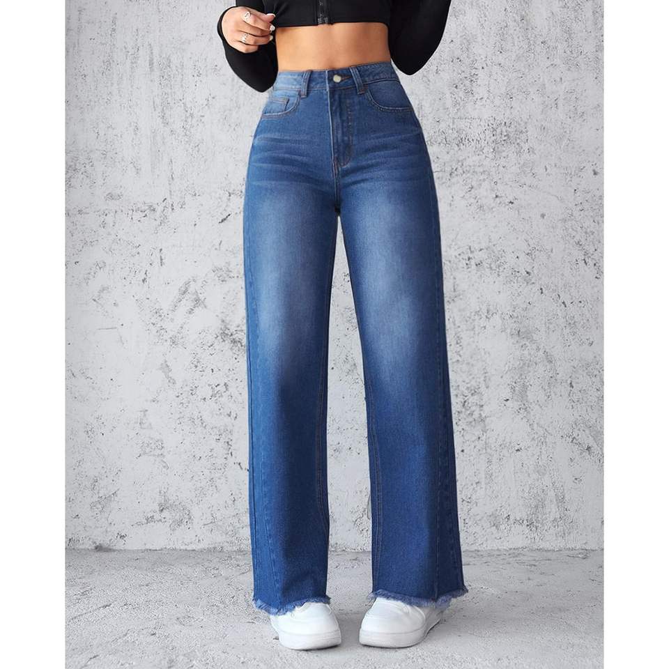 2025 Women's Baggy High-Waisted Straight Wide Leg Boyfriend Jeans Raw Hem Loose Long Denim Pants Flare Breathable Design