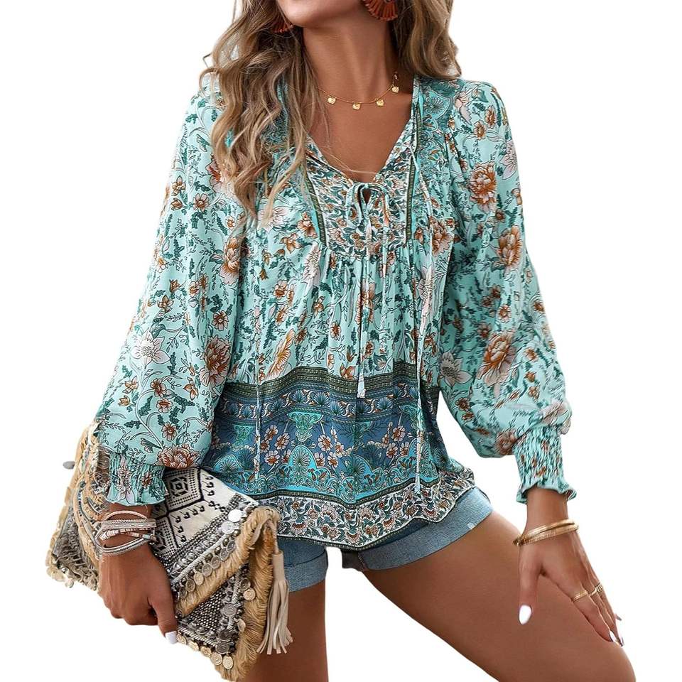 2025 Women's Boho Floral Print Blouses V Neck Long Sleeve Top Drawstring Casual Elastic Cuffs Sizes XS XL Embroidered Logo