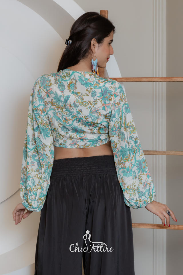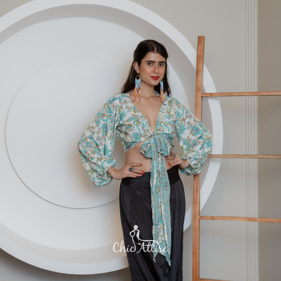 Decoration:Tie Front, Allover Floral Print & Gathered Cuffs