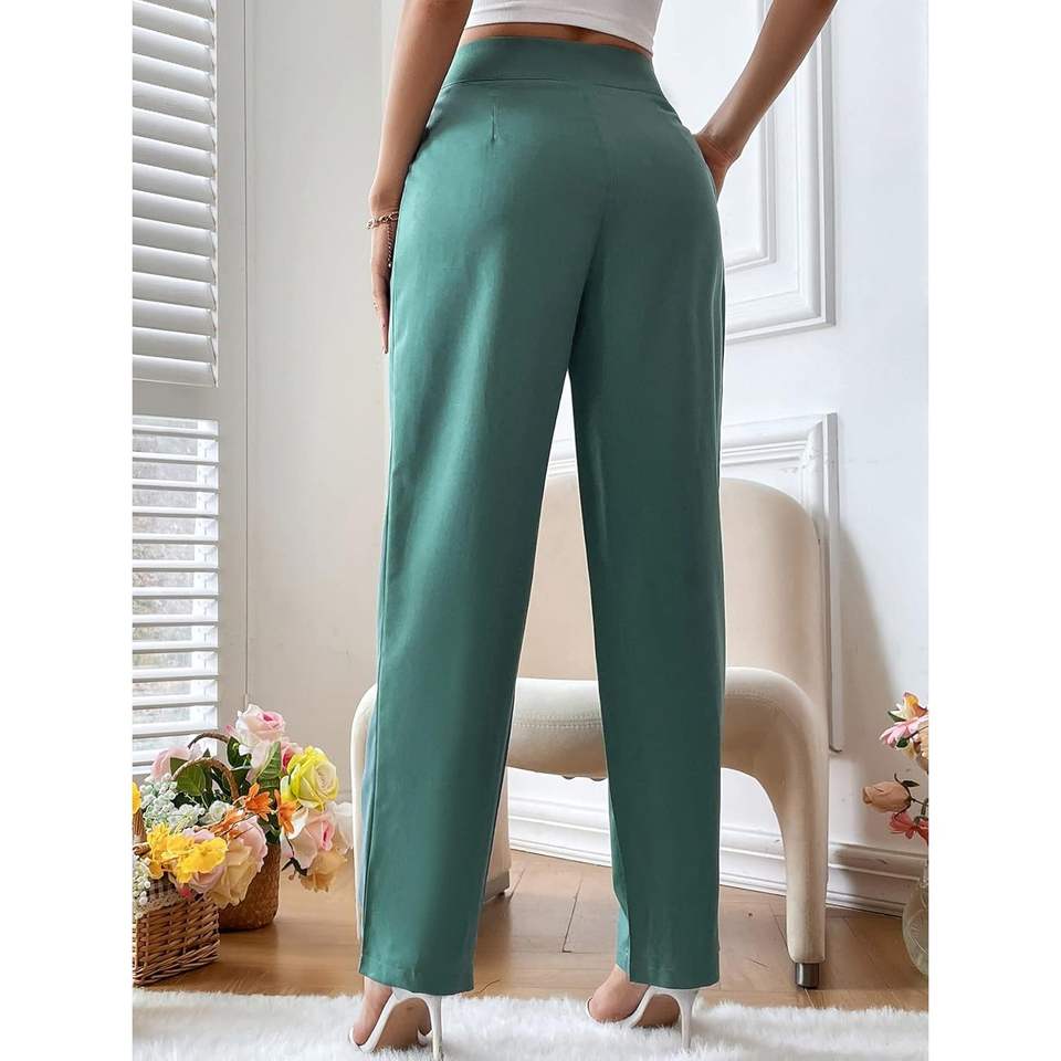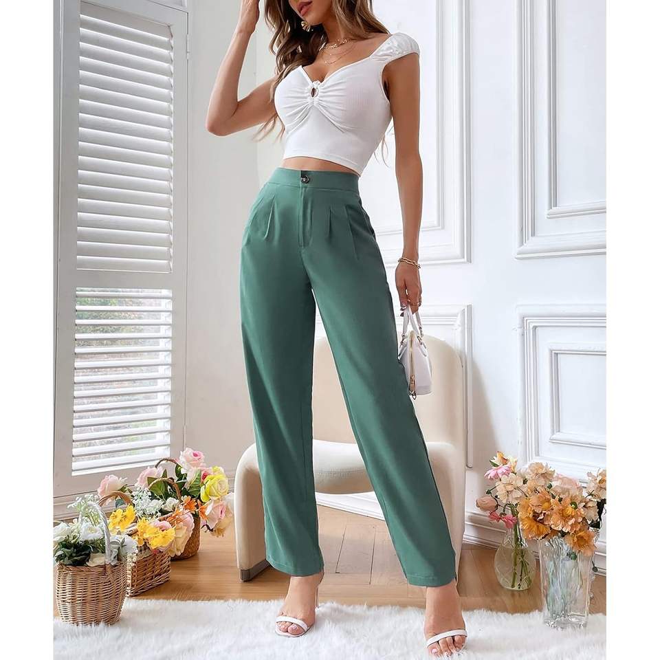 2025 Women's High-Waisted Pleated Dress Pants Breathable Mid Waist Straight Leg Office Casual Solid Color Trouser