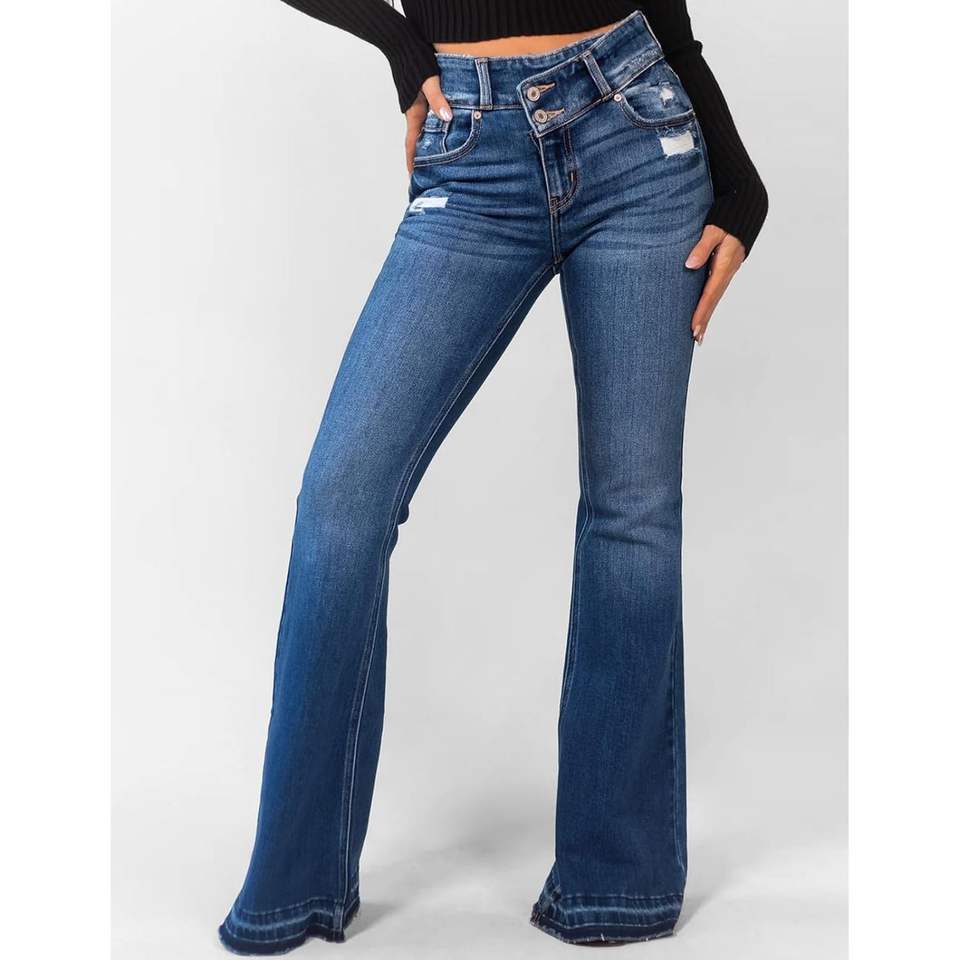 2025 Women's High-Waisted Stretchy Flare Jeans Skinny Ripped Bell Bottom Denim Pants with Pockets Slim Style Breathable Design