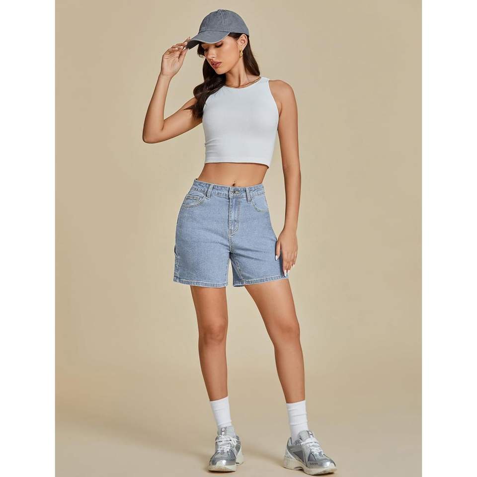 2025 Women's High-Waisted Trendy Casual Utility Jean Shorts Stretchy Denim Jorts Pockets Mid-Waist Skinny Long Cutoff Shorts