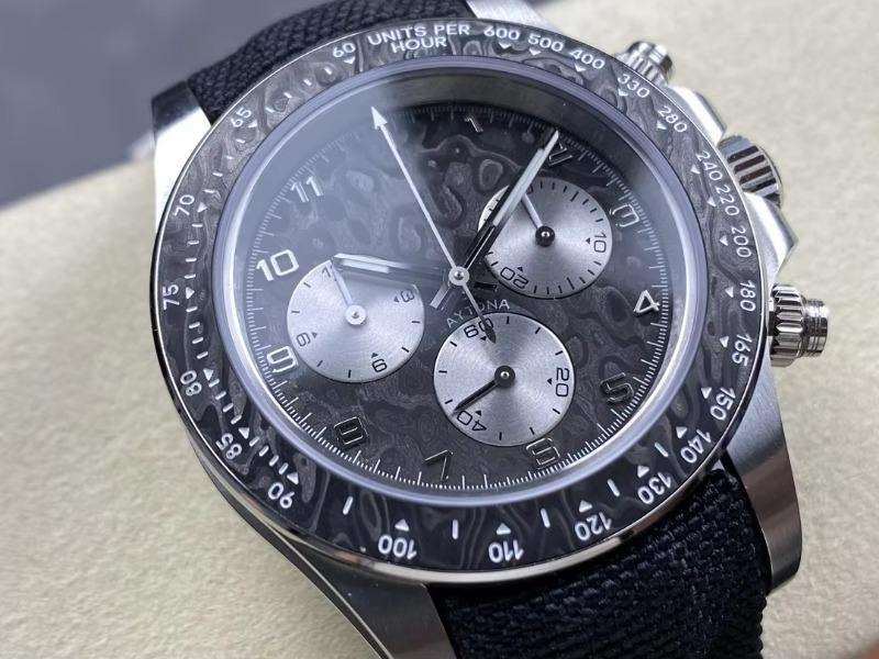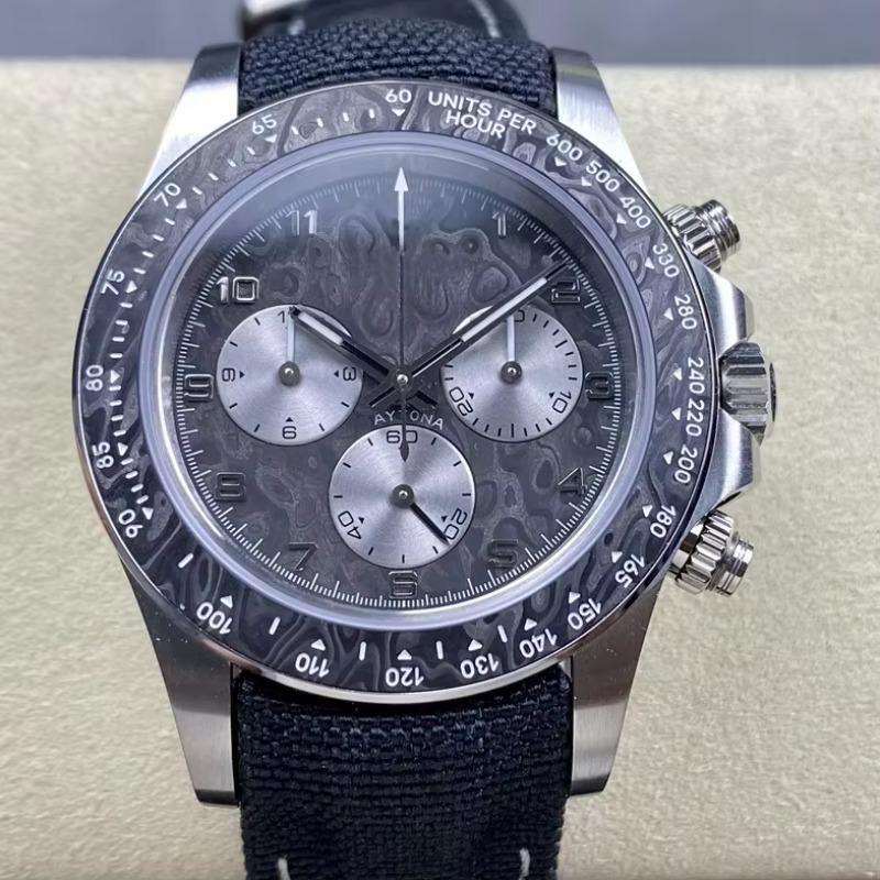 2025 luxury men's mechanical chronograph watch with a meteorite-patterned dial and a nylon woven strap.