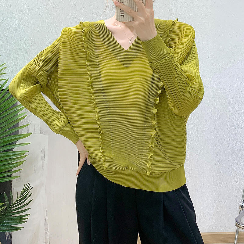 2025 New Pleated Design Loose Summer Women's Solid Color Pullover Long Sleeved Multifunctional Casual Commuting T-shirt In-stock