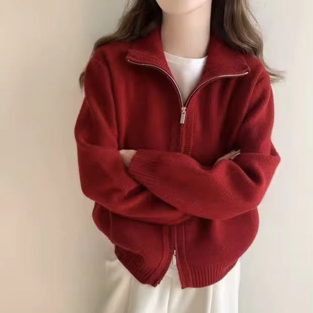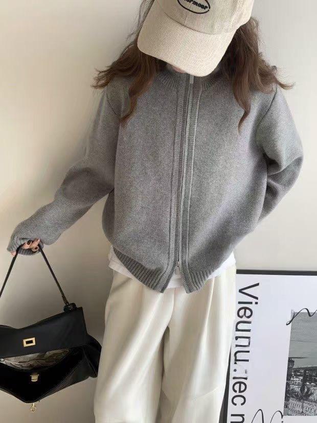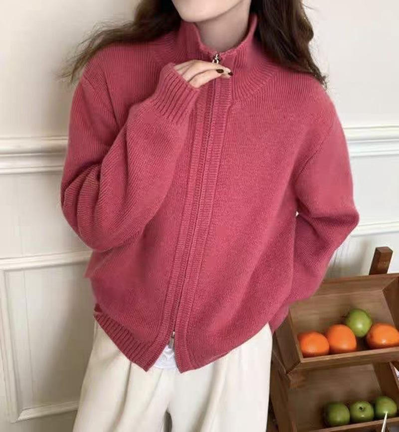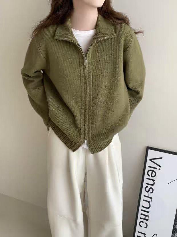 2025 new women's loose sweater fashionable simple solid color knitted cardigan versatile casual double zipper sweater jacket