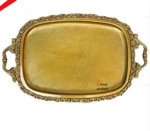 2025 royal look golden finished metal serving tray with designer handle for hotel restaurant and bar