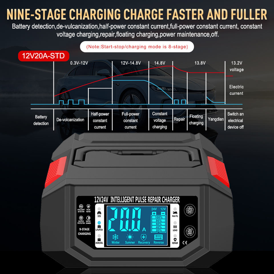 Chargeur de batterie universel 12/24 V 20 A avec détection intelligente pour batteries plomb‑acide et LiFePO4 (voiture/moto) 2025