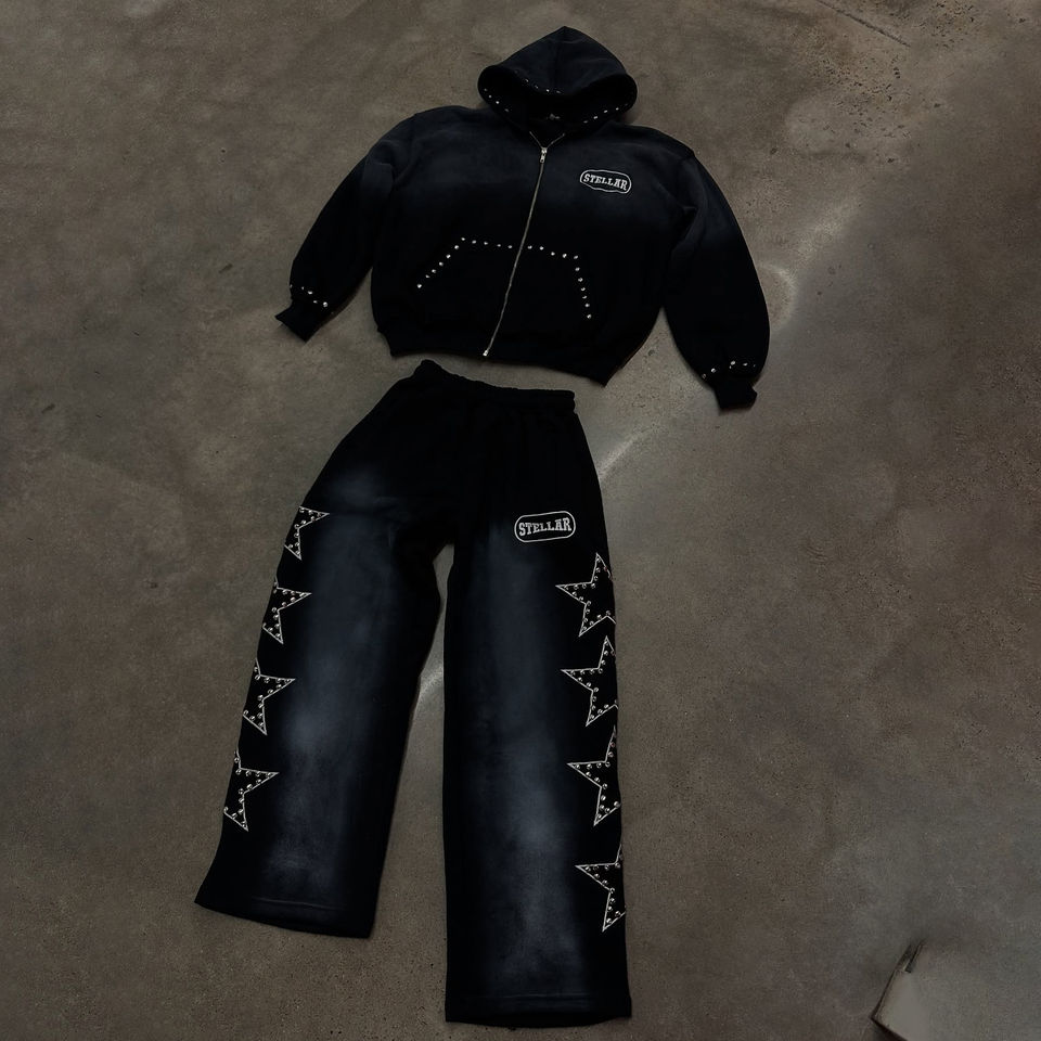 2026 Survêtement en molleton 100% polyester avec strass, coupe évasée, logo personnalisé, pantalon baggy zippé délavé à l'acide, décontracté hiver