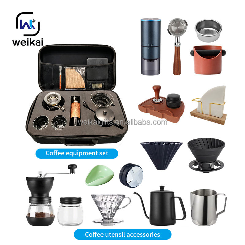 10pcs coffee set includes::Coffee Grinder,Kettle,Dripper,Server,Mugx2pcs,Scale,Filter,Brush,Spoon