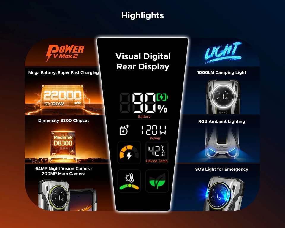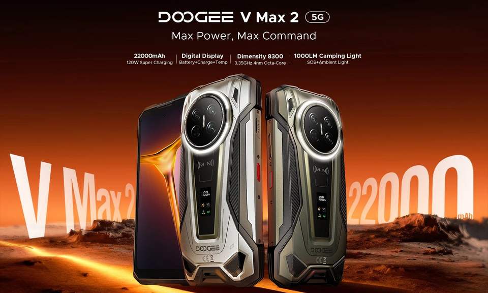 Smartphone robuste DOOGEE V MAX 2 5G 2026 avec processeur Dimensity 8300, écran numérique, 16 Go + 512 Go, batterie 22000 mAh, écran FHD+ 6,78 pouces, 200 MP