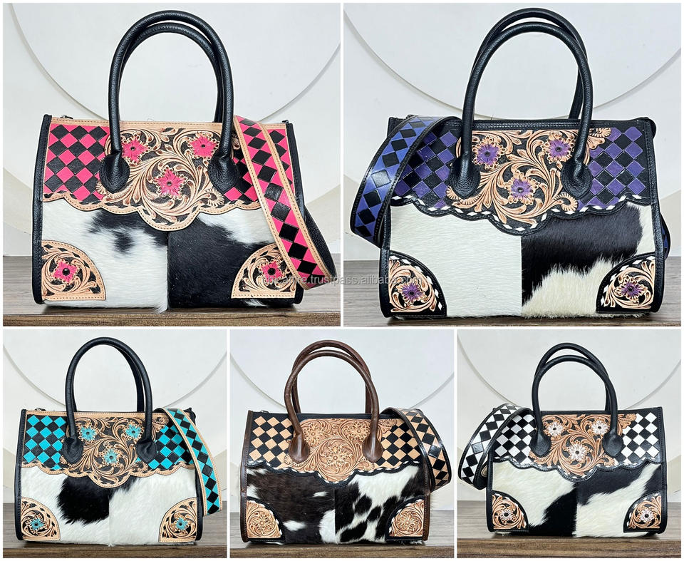 Product name:Hand Tooled Checkered Leather Crossbody Tote Bag