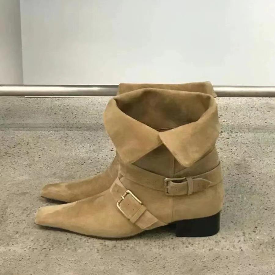 Bottes mi-mollet pour femme en cuir véritable et daim, style rétro, à bout carré, à porter 2 façons, avec talon épais et boucle, collection 2026