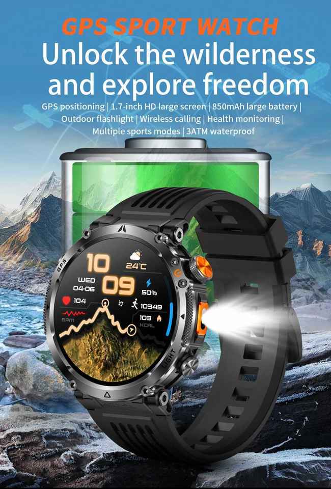 Montre intelligente GPS de sport en plein air HT42 2026 avec lampe de poche, altimètre, baromètre, écran tactile de 1,7 pouces, étanche 3 ATM